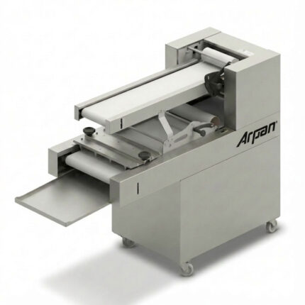 Trinchadora de pan automática, construida íntegramente en acero inoxidable, diseñada para trabajar con altos volúmenes manteniendo cortes precisos y uniformes en cada molde.